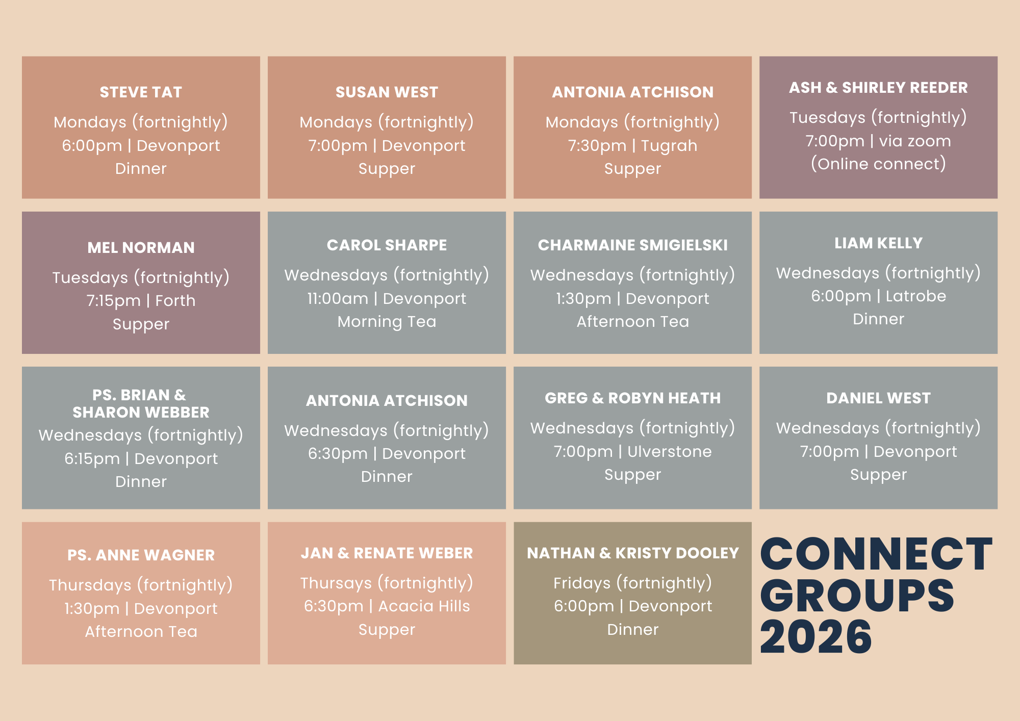 If you’d like to join a Connect Group, please use the form here or email Chris Atchison (chris.atchison@c3churchdevonport.com.au)